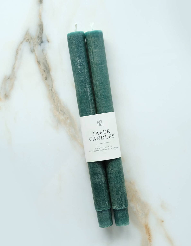 Botanica taper candles pairs are hand-dyed in an array of classic and sophisticated shades to delight your tablescapes & home decor. Each candle is 7/8" diameter, and burns for approximately 10 hours, available in classic pillar & fluted shapes.
