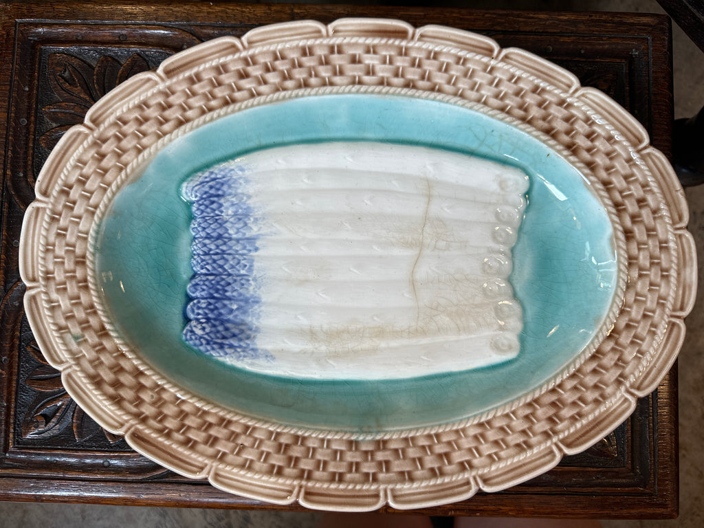 Asparagus Platter, Brown and Turquoise Basketweave design with scalloped turquoise edge, French