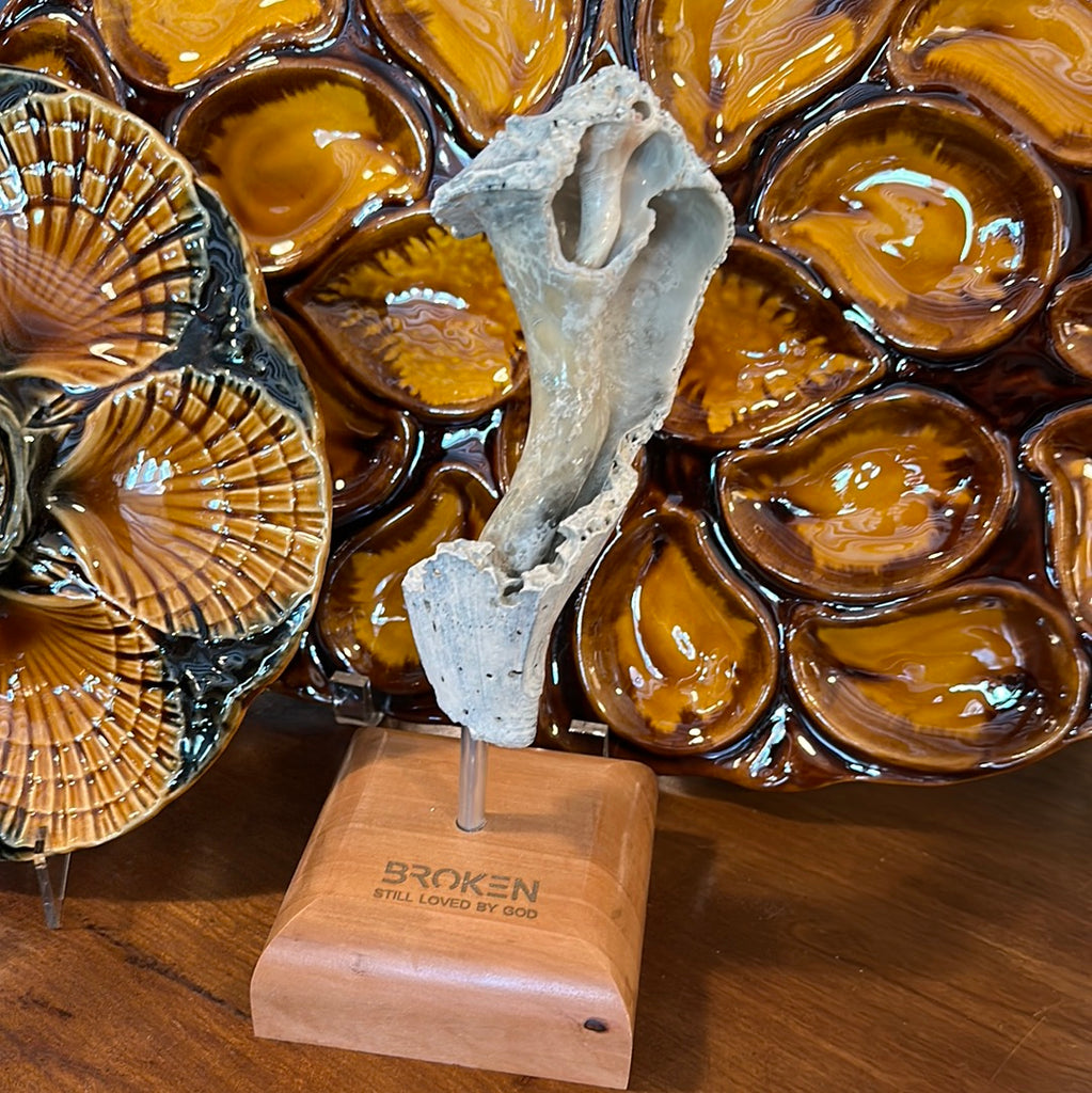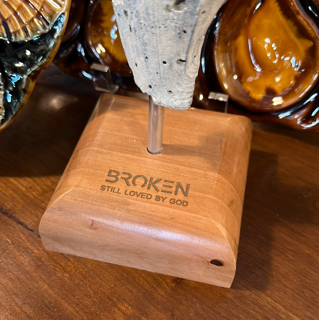 Carl has many talents, woodworking being one, but his unwavering commitment to sharing the faithfulness of God in a broken world is a true gift. Each shell was hand selected from beaches all over the world. He has chosen broken shells, as they embody the message he is sharing through each piece: "Broken, Still Loved By God." Each base is made from repurposed wood, found in old churches and places Carl holds near to his heart.