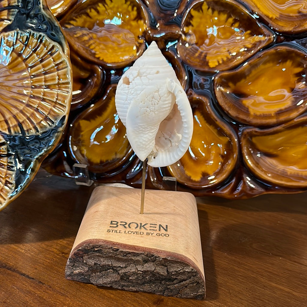 Carl has many talents, woodworking being one, but his unwavering commitment to sharing the faithfulness of God in a broken world is a true gift. Each shell was hand selected from beaches all over the world. He has chosen broken shells, as they embody the message he is sharing through each piece: "Broken, Still Loved By God." Each base is made from repurposed wood, found in old churches and places Carl holds near to his heart.