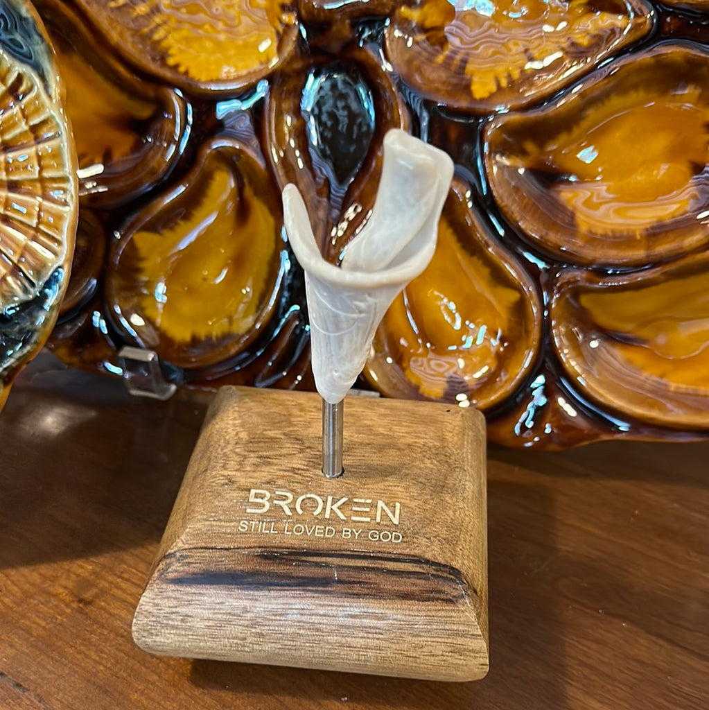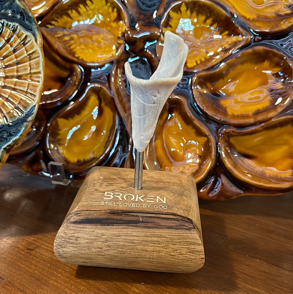 Carl has many talents, woodworking being one, but his unwavering commitment to sharing the faithfulness of God in a broken world is a true gift. Each shell was hand selected from beaches all over the world. He has chosen broken shells, as they embody the message he is sharing through each piece: "Broken, Still Loved By God." Each base is made from repurposed wood, found in old churches and places Carl holds near to his heart.