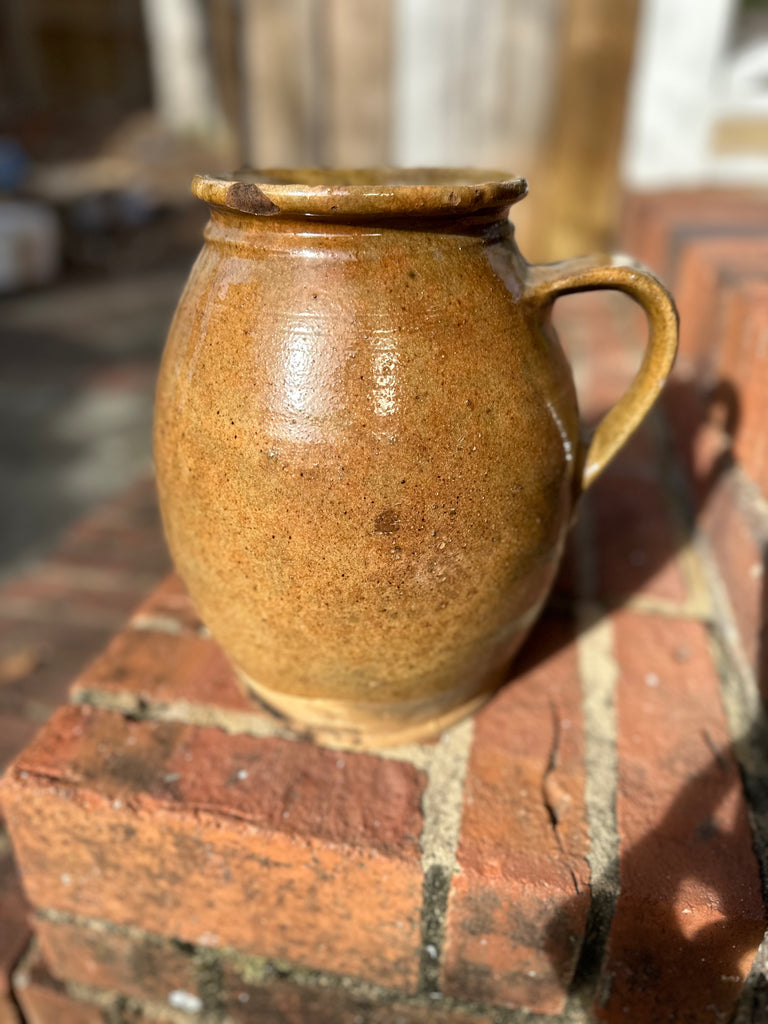 Large Brown and Green Pyrenees Jug, the color of the glaze seems to change from green to brown as you turn the jug. Beautiful shape and great larger size. 10”H
