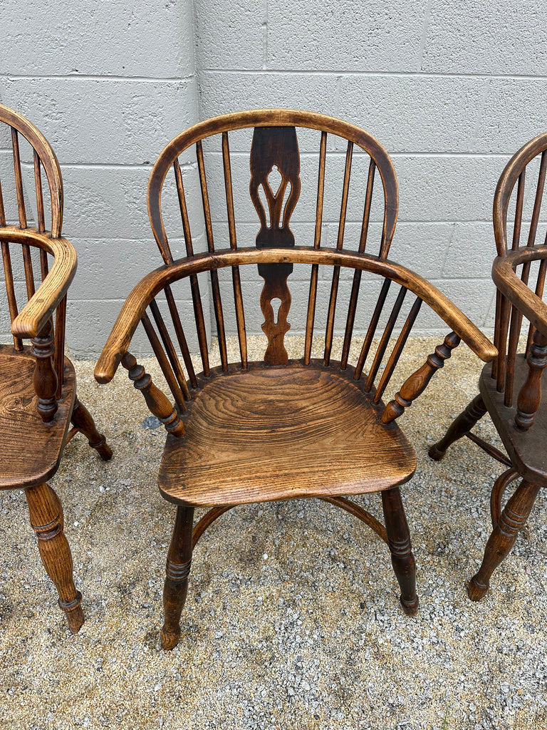 Set of 4 19th Century Elm and Ash Low Back Windsor Arm Chairs. A "harlequin" set, these chairs are all in excellent condition and all of similar size and shape, with only the smallest differences. A rare, and stunning group, indeed!