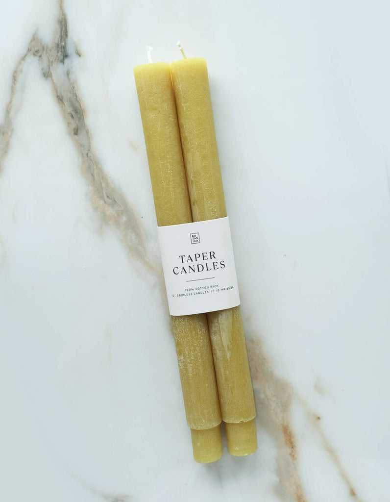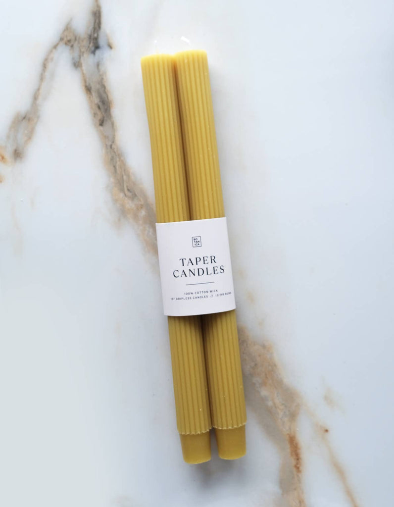 Botanica taper candles pairs are hand-dyed in an array of classic and sophisticated shades to delight your tablescapes & home decor. Each candle is 7/8" diameter, and burns for approximately 10 hours, available in classic pillar & fluted shapes.
