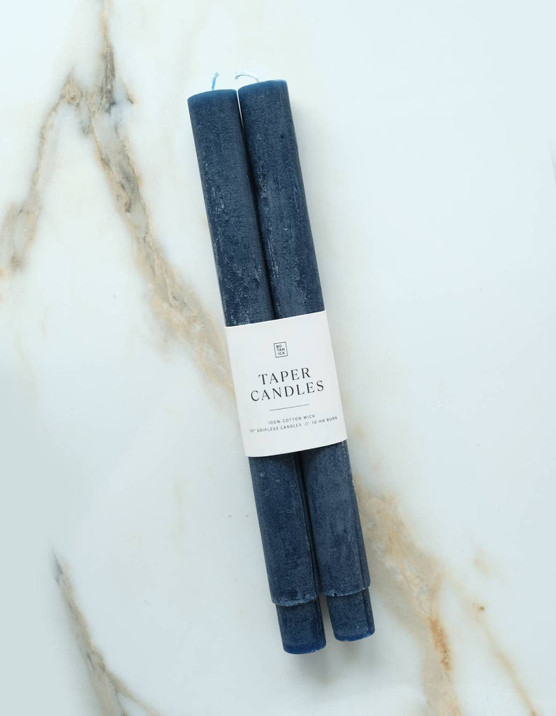 Botanica taper candles pairs are hand-dyed in an array of classic and sophisticated shades to delight your tablescapes & home decor. Each candle is 7/8" diameter, and burns for approximately 10 hours, available in classic pillar & fluted shapes.